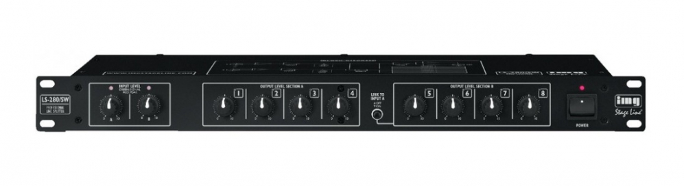 8-way line splitter with a 2 separate inputs. XLR connection and gain control for each input and output. Signal and a peak indication for the inputs via dual LEDs.