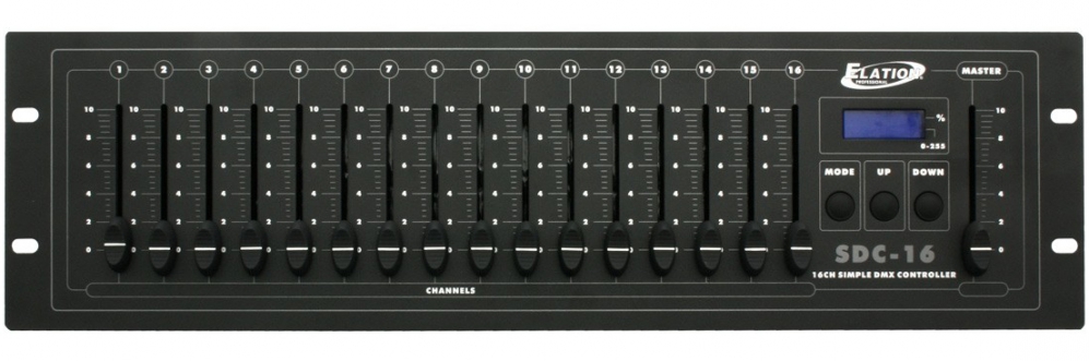 The Elation SDC-16 DMX controller is the easiest way to control various DMX fixtures, which do not need to be programmed. Ideal for the classical stagelighting and LED lights. The SDC 16 can control up to 16 channels. You can choose between displaying the real DMX-value (0-255) or the relative-value (0- 100%). Addressing begins at channel 1 (Preset) and can be changed. Easy to use - no programming needed.