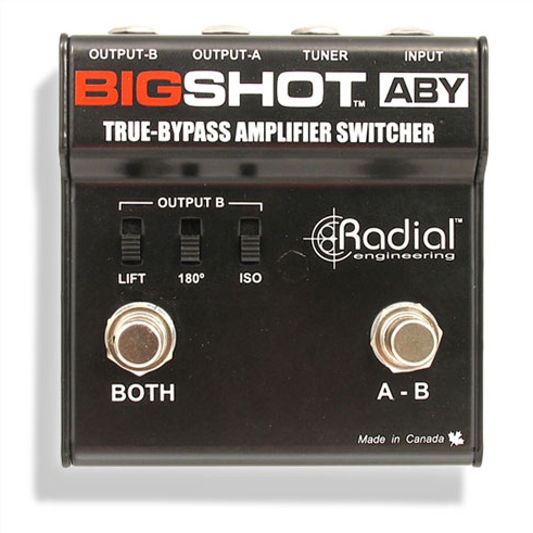The Radial BigShot ABY is a compact ABY switcher that enables you to either switch between two amplifiers or combine the signal when you want both amps to play at the same time. Designed for the purist, this true-bypass ABY switcher is completely passive meaning that there are no tone altering buffers in between the guitar and the amplifier. With the BigShot ABY, you get the pure tone from your guitar plugged direct into your amp! To add versatility, the BigShot ABY is also equipped with a separate tuner out. This 'always on' output feeds your tuner for constant monitoring while keeping it out of the signal chain. Should you experience hum and buzz problems due to ground loops, the BigShot ABY comes to the rescue with a ground lift switch and built-in isolation transformer. Once engaged, you can toggle the polarity of the second amplifier to ensure both amps play in absolute phase.