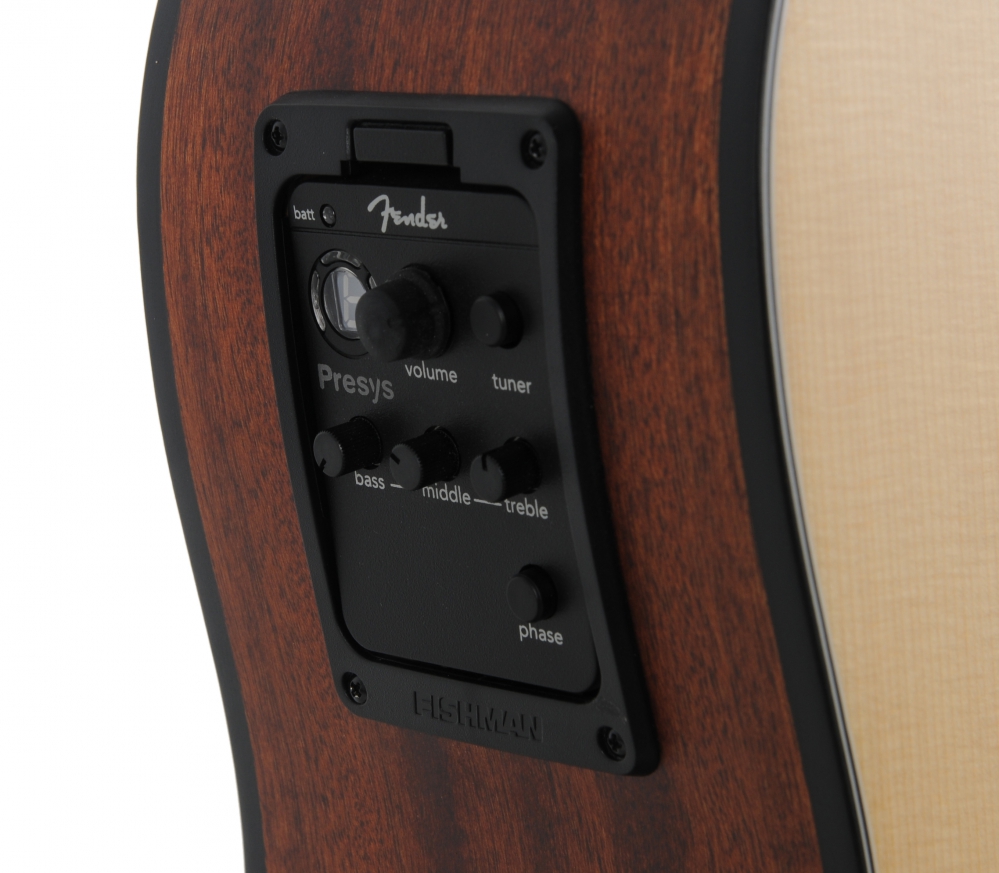 Upgrades include a new tortoise shell pickguard (natural finish model) or black pickguard (black finish model), new mother-of-pearl rosette design, rosewood bridge with compensated Graphtech Nubone saddle, aged bridge pins with black dots, mother-of-pearl Fender logo headstock inlay, and smaller (3 mm) dot fingerboard inlays. Features include scalloped "X"-bracing, 20-fret rosewood fingerboard, dual-action truss rod and Fishman® Presys™ pickup system with active onboard preamp, tuner, volume and tone controls and low-battery indicator light.