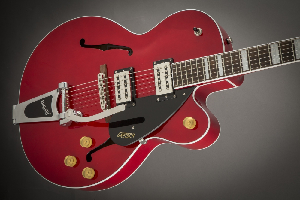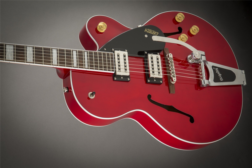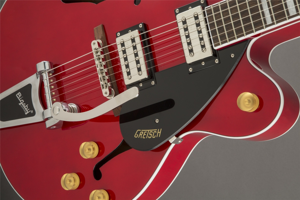 All the classic eye-catching style you’ve come to expect from Gretsch is here—vintage-style gold control knobs, F Holes, elegant two-ply white and black body binding, slick-looking nickel hardware, arched laminated maple construction and single-ply black pickguard with Gretsch logo. Nearly impossible to put down once you pick it up and start playing, the G2420T Streamliner Single Cutaway Hollow Body with Bigsby is an astounding take on the classic sound and style you’ve come to expect from Gretsch.