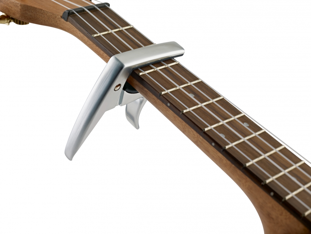 A beautiful little capo for ukuleles. The clamping mechanism can be operated quickly and easily with just one hand. The rubber padding secures the capo to the fretboard and prevents slipping.
